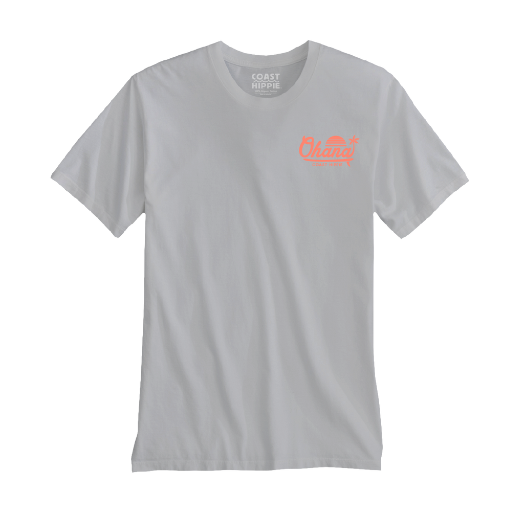 This tee features bold coral script with a sunset horizon and palm detail, bringing warm, tropical energy to a classic coastal staple.