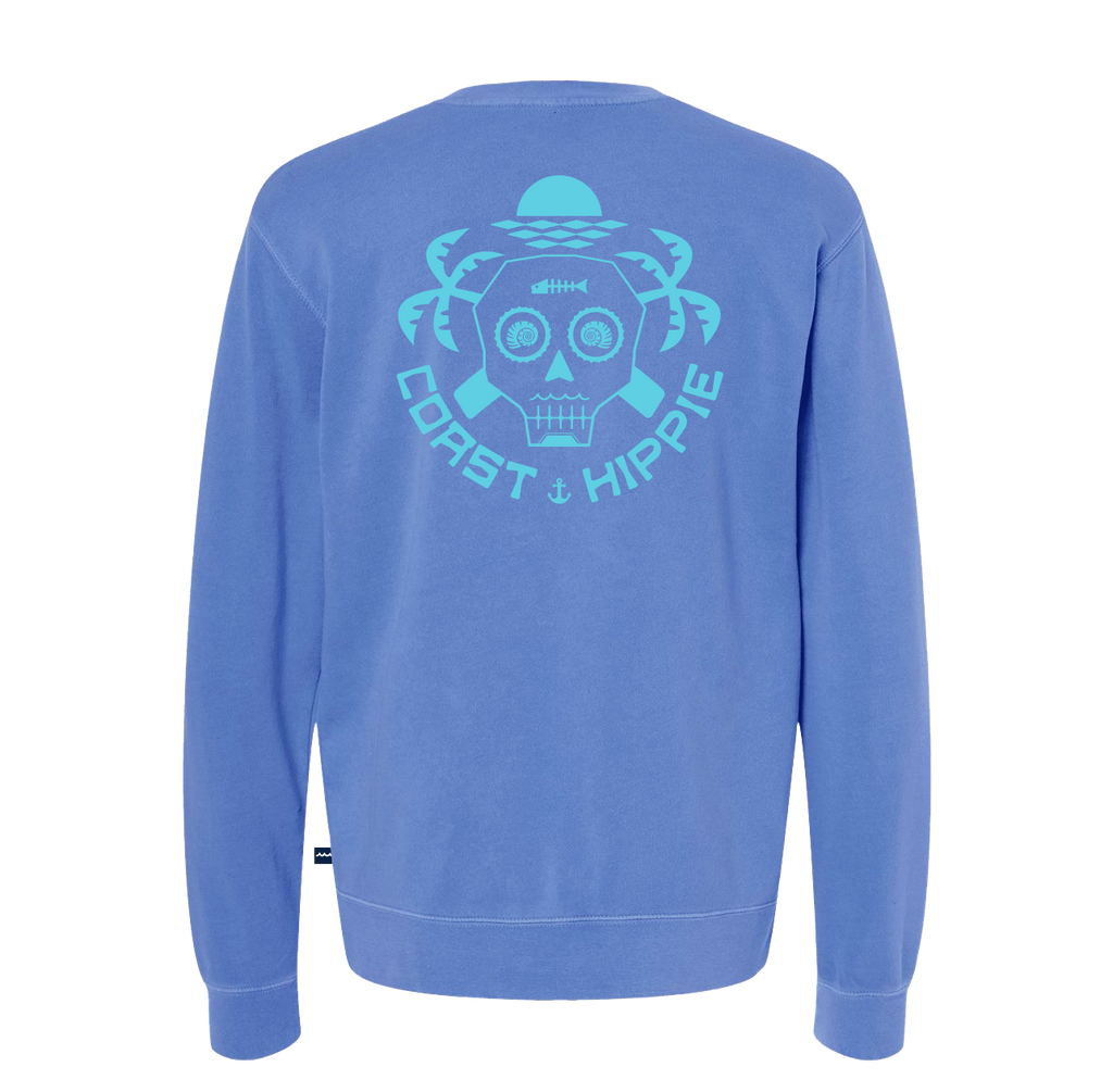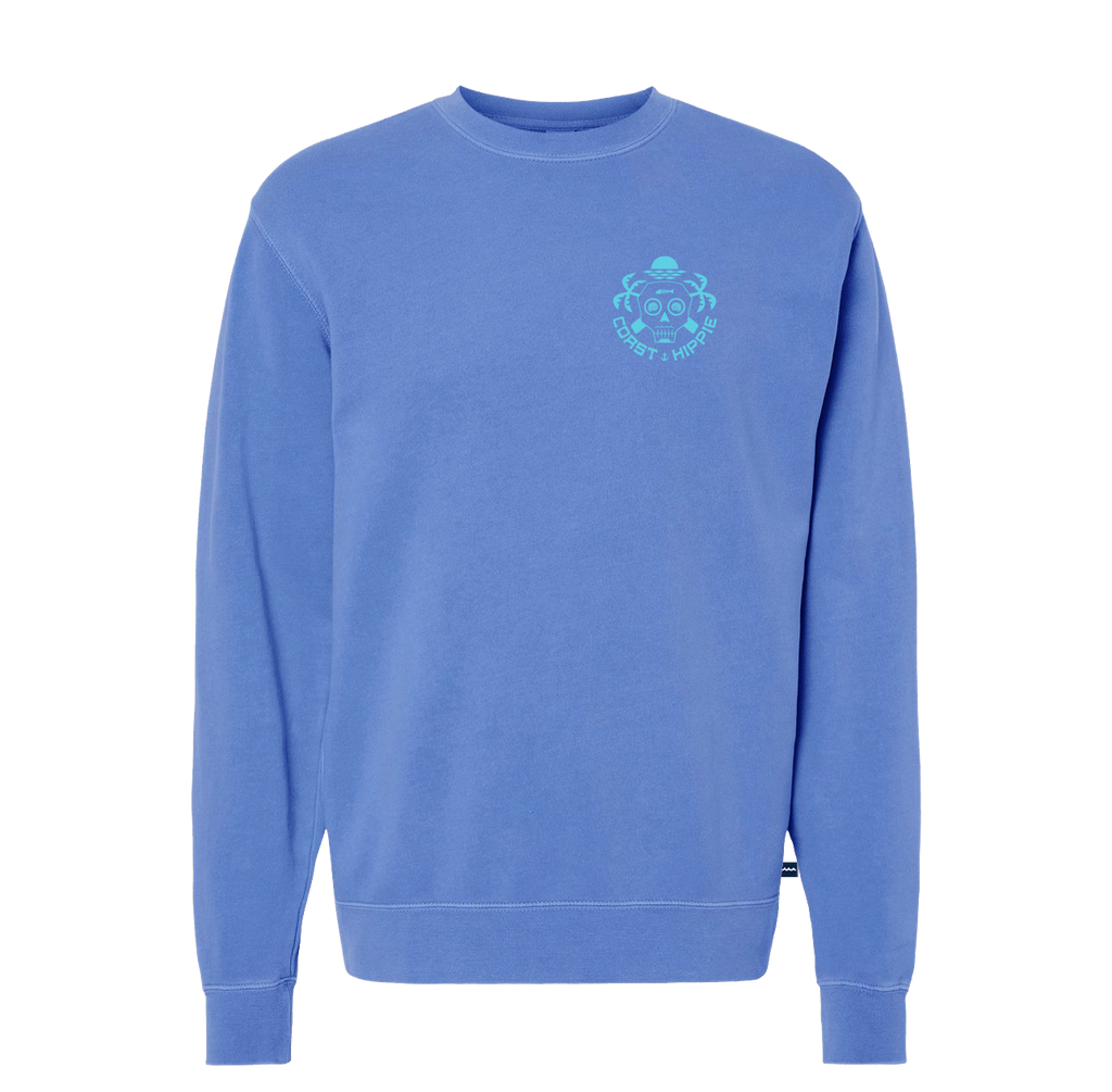 Vintage washed crew neck featuring a small skull logo on the front left chest and large across the back.